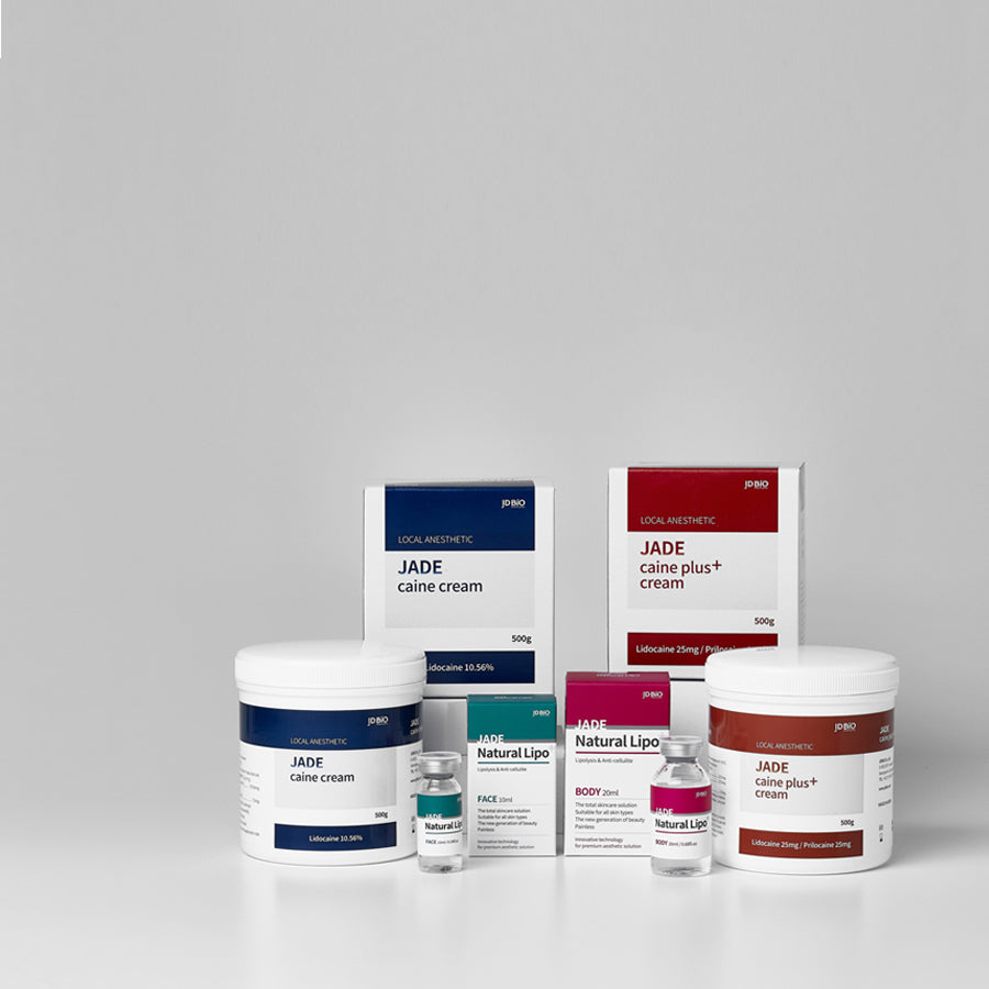 JADE™ caine cream은 리도카인 10.56%를 함유한 국소 마취제로, 시술 중 통증을 효과적으로 완화해줍니다. 민감한 피부에도 부담 없이 사용할 수 있도록 개발되었으며, 작용 시간과 마취 지속력이 우수하여 시술 전 준비 시간을 단축시켜줍니다.
